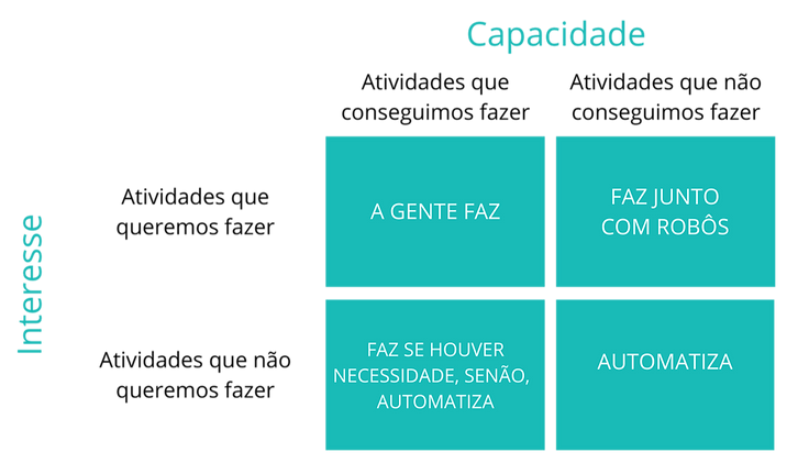 Essa análise mostra que o foco agora são atividades que ou não queremos fazer ou não conseguimos fazer, então, se o seu trabalho se encaixa em algum desses pontos, aí sim pode ser automatizado por robôs.