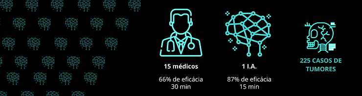 Um exemplo claro é o estudo de análise de imagens para diagnosticar câncer. Foram escolhidos 15 médicos especialistas para analisar 225 casos de tumores cerebrais contra uma máquina com I.A., e o resultado foi o seguinte: